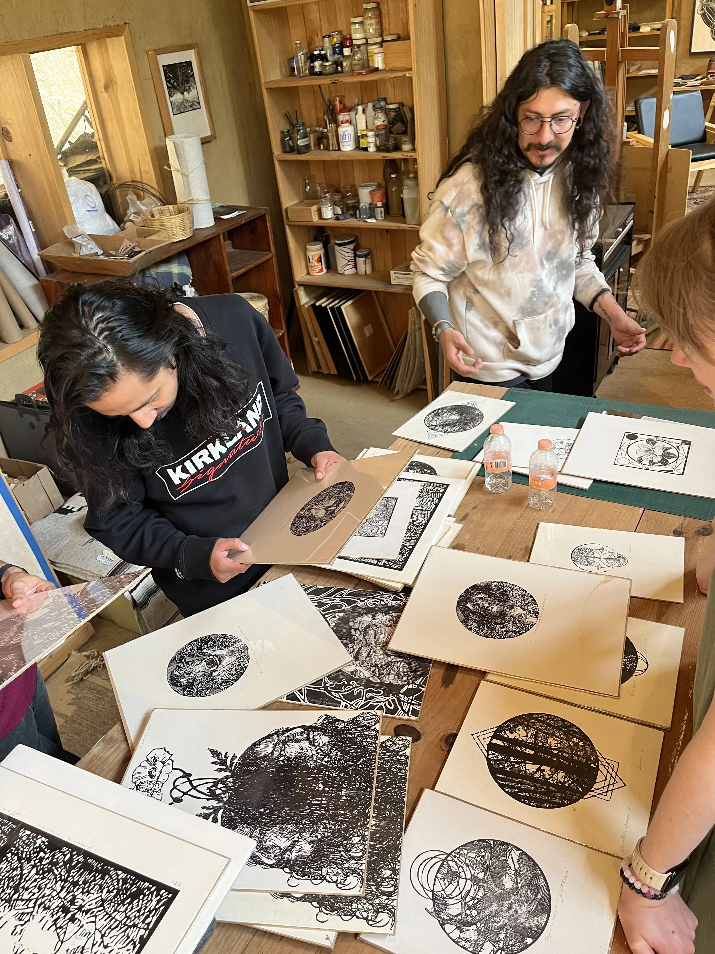 Through all the trials and triumphs, the actual value of this journey was the learning process — not just about printmaking, but about life itself. The openness to experience, to listen, and to reflect was invaluable. One of the most profound experiences was spending time with Carlos Bautista and his family in the mountains of Oaxaca, eating Memelas. Their way of life, deeply connected to nature, was a powerful inspiration. They've magically cultivated an existence that merges art, family, and the natural world. The tranquility and thoughtfulness of the space they've created are unlike anything I've ever seen. It was a moment of awe that will stay with me forever.